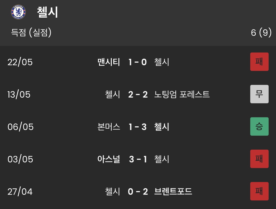 첼시의 최근 5경기 리그 성적은 1승 1무 3패, 첼시는 현재 11승 10무 15패 승점 43점으로 12위에 위치해 있다. 최악의 시즌을 보낸 첼시는 이번에 포체티노 감독과 계약한 만큼 다음 시즌을 기대해야 할 것으로 보인다.