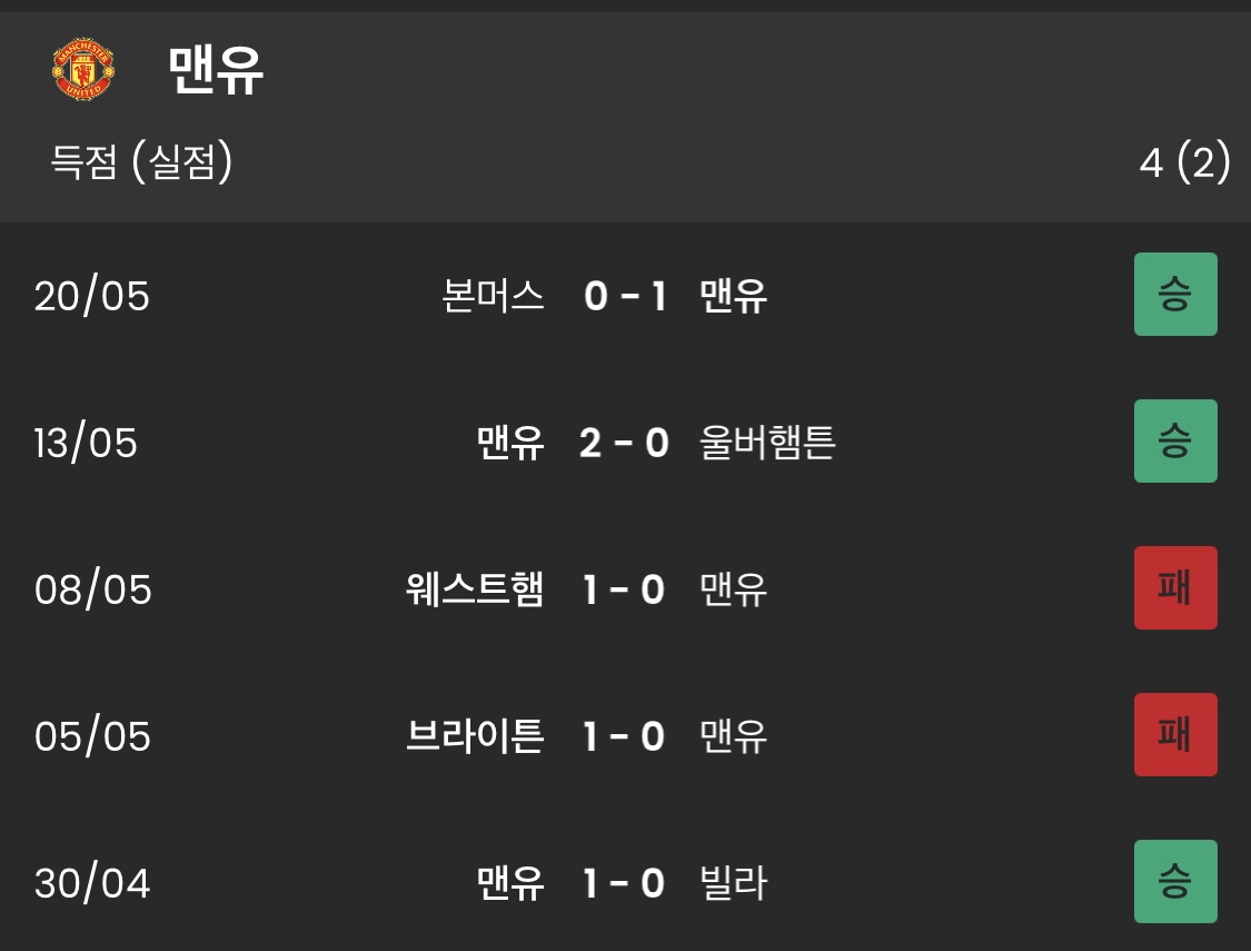 맨유의 최근 5경기 리그 성적은 3승 2패, 맨유는 현재 2경기를 남긴 상황에서 21승 6무 9패 승점 69점으로 4위에 위치해 있지만 5위에 있는 리버풀과 승점차가 3점밖에 차이 나지 않아 남은 경기 모두 승리를 챙겨야 하는 상황이다.