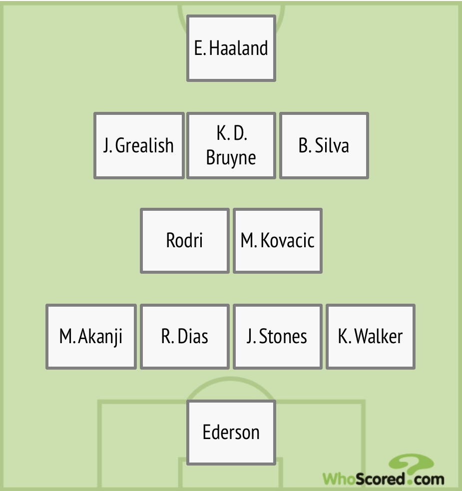원정팀 맨체스터 시티의 펩 과르디올라 감독은 4-2-3-1 포메이션을 들고 나올 것이라 예상했으며 골문은 에데르송 모라에스가 지킨다. 이어 포백에는 마누엘 아칸지, 후벵 디아스, 존 스톤스, 카일 워커가 나서며 로드리, 마테오 코바치치가 3선에 나선다. 그리고 2선에는 잭 그릴리쉬, 케빈 더 브라위너, 베르나르두 실바가 나서고 엘링 홀란드가 최전방에 나선다.