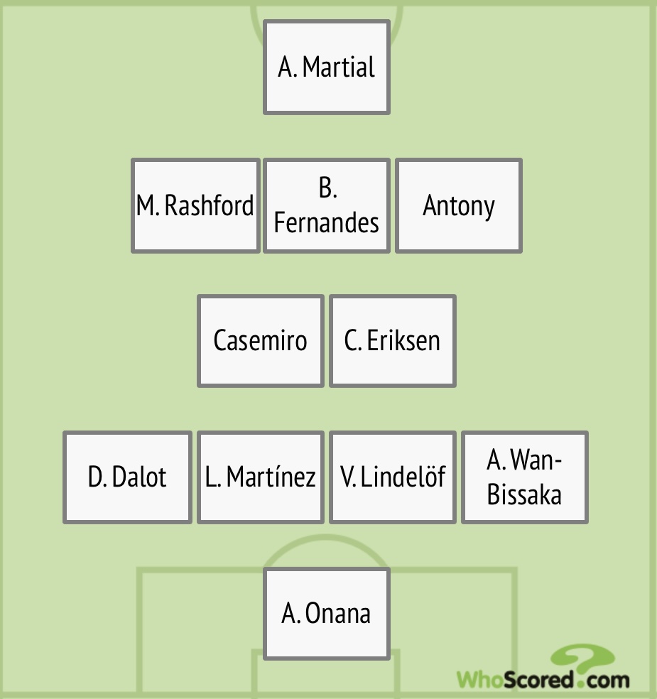 원정팀 맨유의 에릭 텐 하흐 감독은 4-2-3-1 포메이션을 들고 나올 것이라 예상했다. 골키퍼 장갑은 안드레 오나나가 끼며 디오구 달롯, 리산드로 마르티네즈, 빅토르 린델로프, 아론 완비사카가 포백으로 나선다. 이어 3선에는 카세미루와 크리스티안 에릭센이 나서며 마커스 래시포드, 브루노 페르난데스, 안토니가 2선에 나선다. 마지막 최전방에는 앙토니 마샬이 나서 아스날 골문을 노린다.