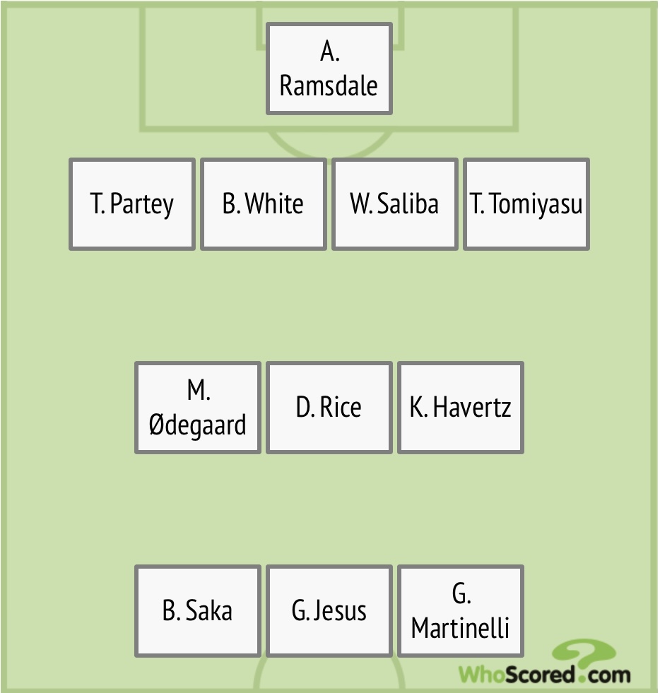 먼저 홈팀 아스날의 미켈 아르테타 감독은 4-3-3 포메이션을 들고 나올 것이라 예상한 가운데 골키퍼 장갑은 아론 램즈데일이 낀다. 이어 포백에는 토마스 파티, 벤 화이트, 윌리엄 살리바, 토미야스 타케히로가 나서며 마르틴 외데고르, 데클란 라이스, 카이 하베르츠가 중원에 나선다. 그리고 공격을 책임질 최전방에는 부카요 사카, 가브리엘 제주스, 가브리엘 마르티넬리가 나선다.