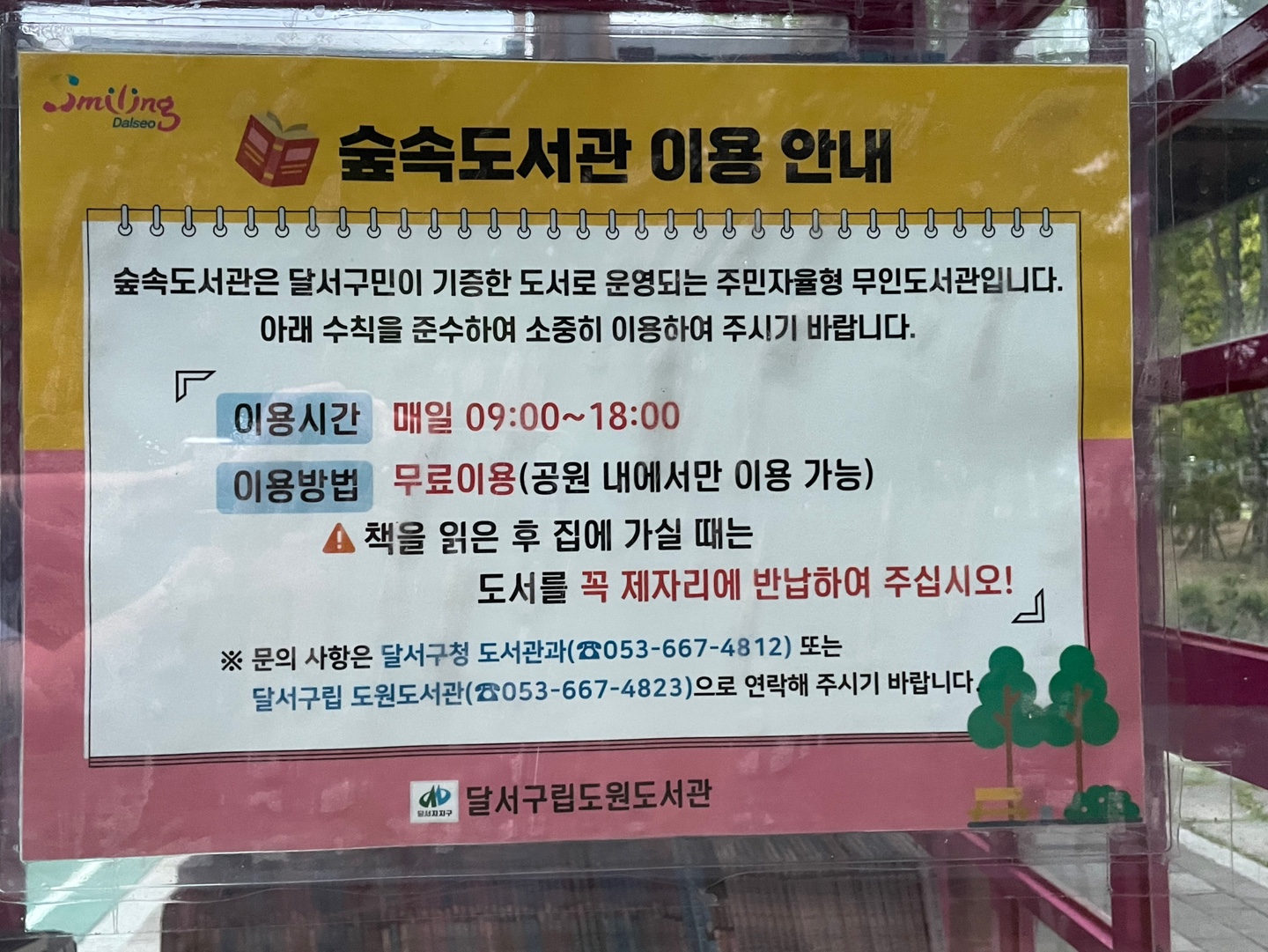 숲길 안에는 놀이터도 있고 공중전화처럼 생긴 도서관도 있어요
